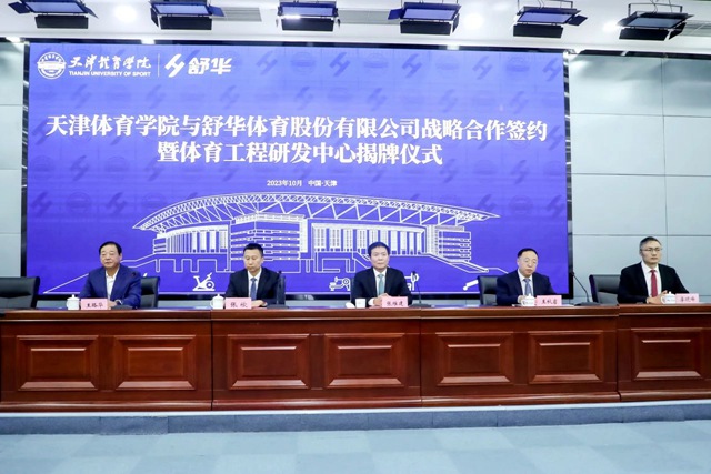 2023年10月10日,舒华体育股份有限公司与天津体育学院战略合作签约暨体育工程研发中心揭牌仪式在天津举行。天津市市委教育工委委员、市政府教育督导室总督学王秋岩,天津市体育局副局长(一级巡视员)王路华,舒华体育董事长兼总裁张维建、副总裁李晓峰,天津体育学院校党委副书记、院长张欣出席。签约仪式由天津体育学院副院长张卫国主持。